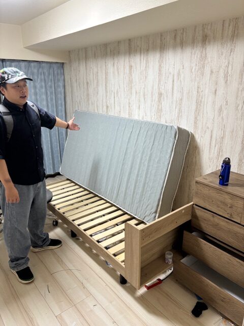 ベッドフレームと収納棚はその場にてインパクトドライバーで分解→部材の運び出しと