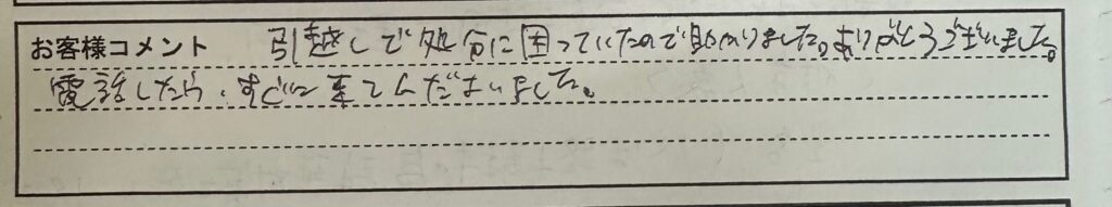 「引っ越しで処分に困っていたので助かりました。ありがとうございました。電話したらすぐに来てくださいました。」
